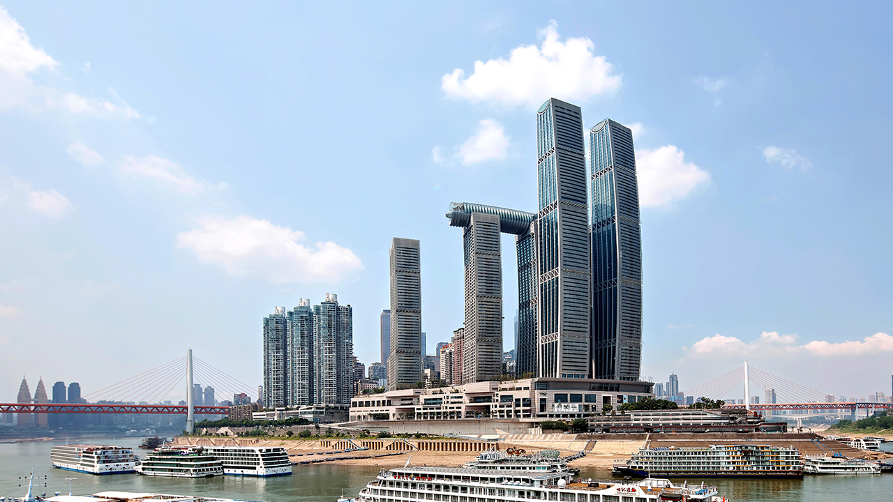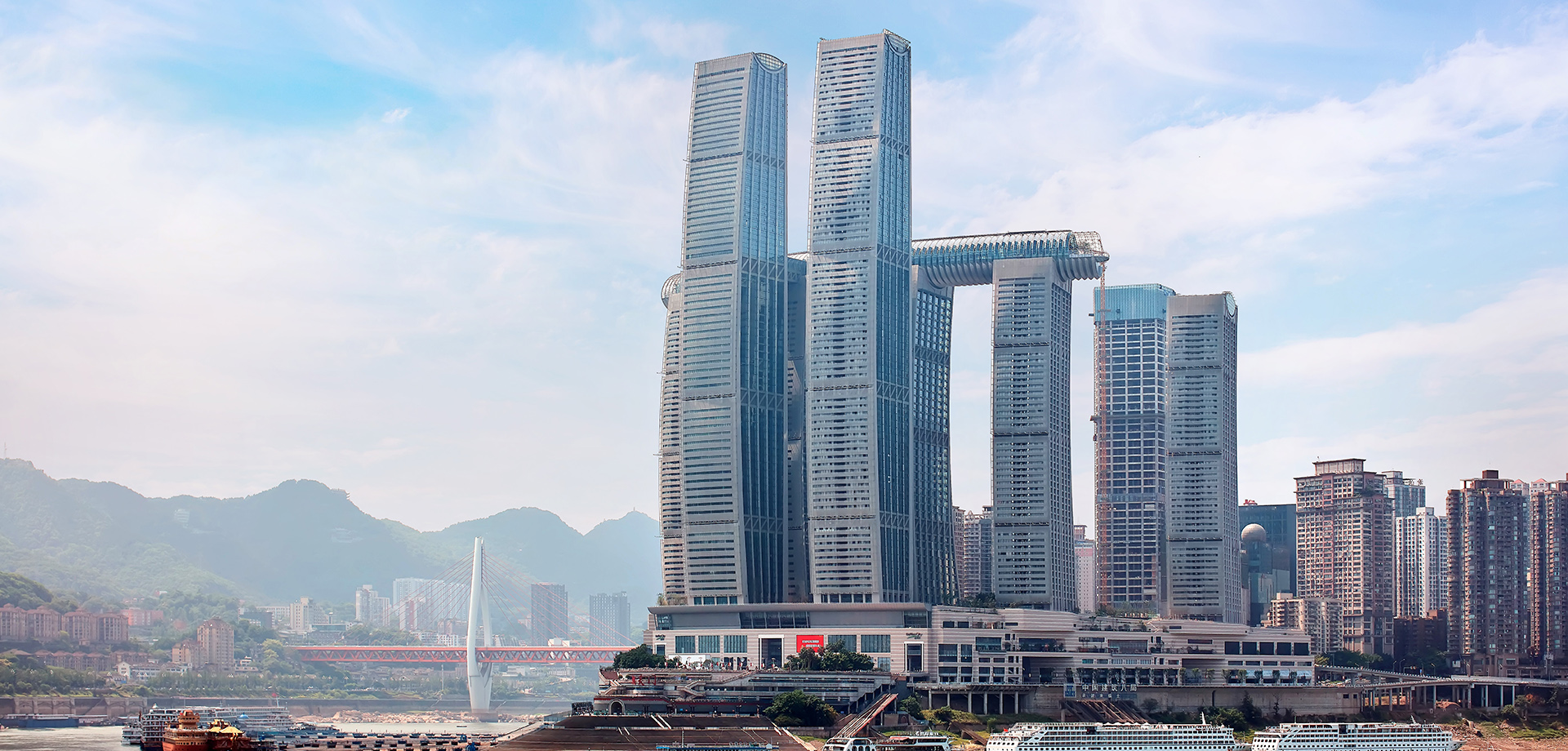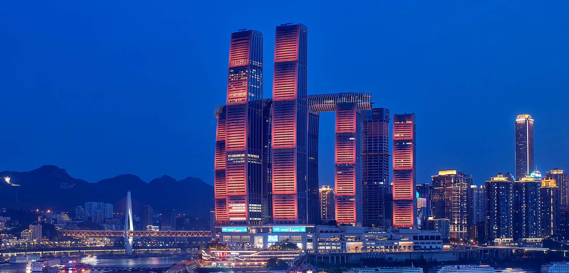 建筑高度:250 m(56層) 幕墻面積:15.3萬m2 項目設計:薩夫迪建筑設計事務所、重慶市設計院 幕墻類型:新型單元式幕墻、石材幕墻 、金屬板幕墻等