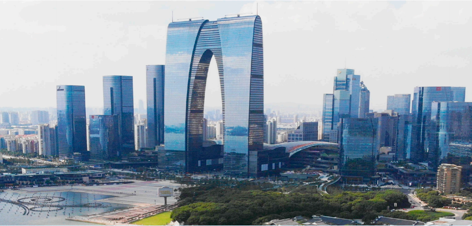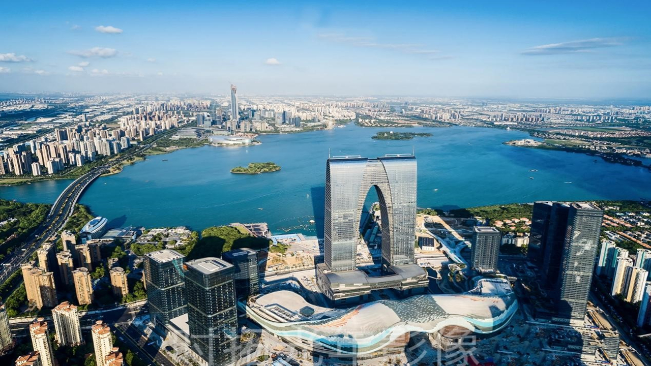 蘇州中心廣場(chǎng)項(xiàng)目位于蘇州工業(yè)園區(qū)金雞湖西側(cè),毗鄰東方之門(mén),居蘇州市域CBD核心位置,軌交1號(hào)線、6號(hào)線貫穿整個(gè)項(xiàng)目區(qū)域,整體占地21.1公頃,凈地面積13.9公頃,總建筑面積約182萬(wàn)平方米,其中地上建筑面積130萬(wàn)平方米、地下建筑面積52萬(wàn)平方米。
