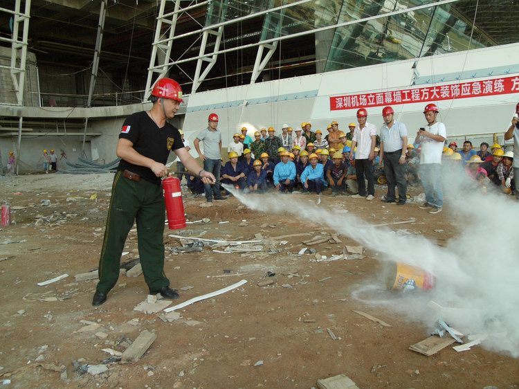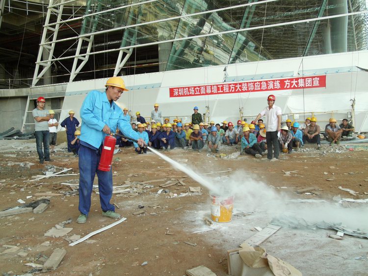 7月3日下午,為了檢驗(yàn)今年全國(guó)“安全生產(chǎn)月”的成果和深圳機(jī)場(chǎng)T3航站樓幕墻工程項(xiàng)目的安全生產(chǎn)應(yīng)急能力,方大集團(tuán)、深圳市方大裝飾工程有限公司組織開(kāi)展了為期半天的幕墻施工防火、防高墜、防坍塌安全事故應(yīng)急演練。集團(tuán)公司安全主管尚清波、裝飾公司安全部經(jīng)理丁志剛、T3航站樓項(xiàng)目部副經(jīng)理高晶參與現(xiàn)場(chǎng)演練組織指揮。這次安全應(yīng)急演練,檢驗(yàn)了現(xiàn)場(chǎng)管理和施工人員面對(duì)緊急情況的應(yīng)急處置能力和水平,提高了大家的安全應(yīng)急意識(shí)和水準(zhǔn),整個(gè)演練過(guò)程銜接到位,收到了良好的預(yù)期效果。