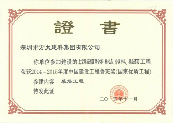 11月17日,中國建筑業協會在北京舉行中國建筑行業最高獎——2014~2015年度中國建設工程魯班獎(國家優質工程)表彰大會,在本屆魯班獎表彰大會中,方大集團股份有限公司全資子公司深圳市方大建科集團有限公司憑借精心打造的高標準、高質量幕墻工程的北京雁棲湖國際會都精品酒店,獲得2014~2015年度中國建設工程魯班獎,“方大品質”作為“深圳質量”的典范再度被全國建筑工程領域所矚目。