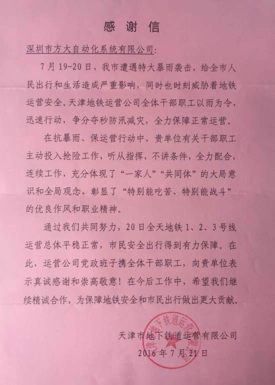 近日,天津地鐵運(yùn)營公司向方大自動化系統(tǒng)有限公司發(fā)來感謝信,高度評價自動化公司在天津地鐵“抗暴雨、保運(yùn)營”行動中的優(yōu)良表現(xiàn)。感謝信說,