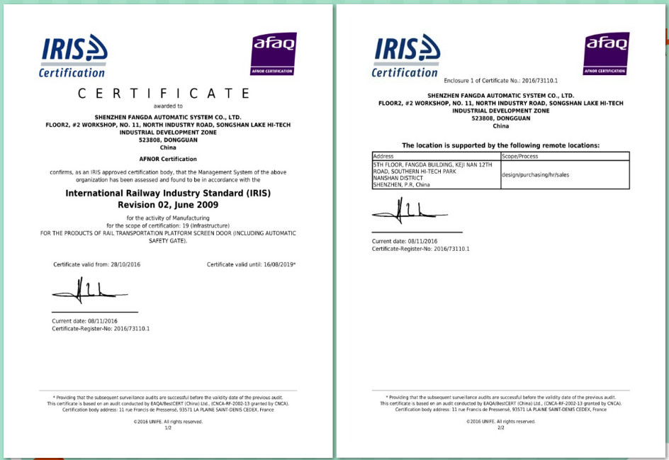 深圳市方大自動化系統有限公司作為全球最大的軌道交通屏蔽門系統供應商,導入IRIS經營管理體系是公司與世界先進管理方法接軌的必要舉措。IRIS管理體系認證證書的獲得,是獨立的第三方機構對方大自動化公司的管理體系符合國際鐵路行業統一規范標準的認可。通過IRIS經營管理體系認證,意味著方大自動化公司的管理體系接軌世界先進管理方法,在ISO9000基礎上進一步提升企業的整體管理水平。在取得IRIS管理體系認證證書后,方大自動化公司的相關認證信息將由IRIS管理中心錄入IRIS門戶網站認證信息庫進行統一管理,同時可供全球鐵路行業客戶進行檢索、瀏覽,這為方大自動化公司拓展市場領域、獲取更多的國際訂單提供了強有力的保障。