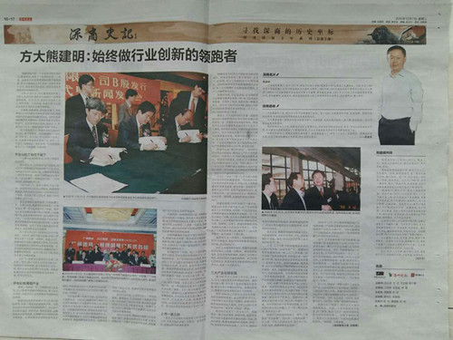 2016年12月7日,《深圳晚報(bào)》深商史記欄目以兩個(gè)整版超大篇幅報(bào)道方大集團(tuán)股份有限公司董事長(zhǎng)熊建明的風(fēng)雨創(chuàng)業(yè)歷程,講述了熊建明董事長(zhǎng)20多年來(lái)在建筑新材料、節(jié)能環(huán)保等行業(yè)領(lǐng)域的奮斗故事,記錄了他把方大集團(tuán)從3萬(wàn)元起家、市場(chǎng)為零的小公司,培育成領(lǐng)先國(guó)內(nèi)同行、坐擁多項(xiàng)技術(shù)成就獎(jiǎng)的領(lǐng)袖級(jí)企業(yè)的傳奇經(jīng)歷,淋漓盡致地展現(xiàn)了熊建明董事長(zhǎng)“敢為天下先”的奮斗姿態(tài)和樸實(shí)的創(chuàng)業(yè)情懷。