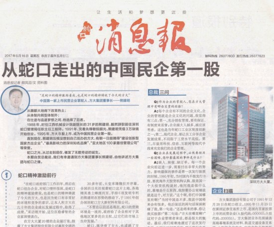 6月16日,《蛇口消息報(bào)》刊登題為“從蛇口走出的中國(guó)民企第一股”專(zhuān)訪文章,重點(diǎn)報(bào)道國(guó)內(nèi)首家上市民營(yíng)企業(yè)——方大集團(tuán)股份有限公司作為蛇口精神的傳承者,成立26年來(lái)始終秉承“科技為本,創(chuàng)新為源”的經(jīng)營(yíng)理念,不忘初心,砥礪前行,在節(jié)能環(huán)保領(lǐng)域不斷取得令人矚目的成就。當(dāng)前,方大集團(tuán)正積極參與“一帶一路”國(guó)際合作和“粵港澳大灣區(qū)”建設(shè),大力拓展海外市場(chǎng),努力將方大高端幕墻系統(tǒng)、方大軌道交通站臺(tái)屏蔽門(mén)等創(chuàng)新成果推向全世界。
