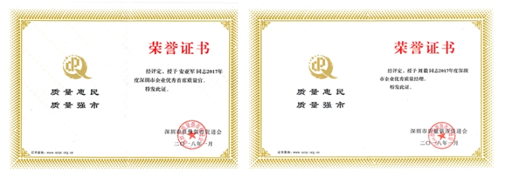 2017年度“深圳市企業優秀首席質量官”、2017年度“深圳市企業優秀質量經理”榮譽稱號由深圳市質量強市促進會組織評選,旨在培養支撐企業首席質量官制度落實的關建人才隊伍,弘揚企業質量文化,引領和推動所在行業質量進步。