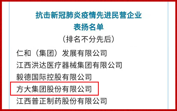 近日,中華全國工商業(yè)聯(lián)合會(huì)發(fā)布《全國工商聯(lián)關(guān)于對(duì)抗擊新冠肺炎疫情做出優(yōu)異成績的先進(jìn)民營企業(yè)予以表揚(yáng)的通報(bào)》,對(duì)“抗擊新冠肺炎疫情先進(jìn)民營企業(yè)”給予表揚(yáng),方大集團(tuán)榜上有名。