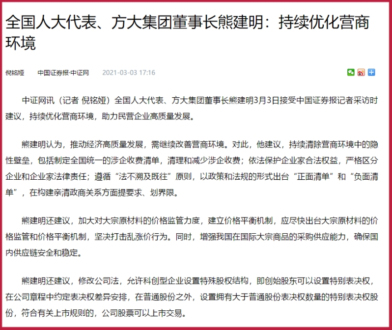 全國人大代表、方大集團(tuán)董事長熊建明3月3日接受中國證券報(bào)記者采訪時建議,持續(xù)優(yōu)化營商環(huán)境,助力民營企業(yè)高質(zhì)量發(fā)展。