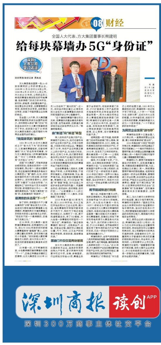 這30年來,方大集團一直深耕建筑幕墻領(lǐng)域。在熊建明內(nèi)心深處,他認為1994年做的深圳新聞大廈幕墻具有“里程碑”意義。這棟大廈位置比較特殊,緊鄰深南大道鄧小平畫像?!吧钲谛侣劥髲B的幕墻是方大做的,到今天快30年了,在深圳的高樓里面還算是有點歷史了?!?/span>